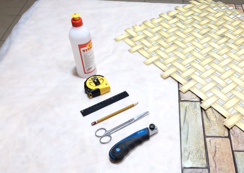 Гипсовые панели или плитку разложить на полу, совместив по рисунку или цвету, если требуется. Обратную сторону гипсовых панелей прогрунтовать для лучшей адгезии.