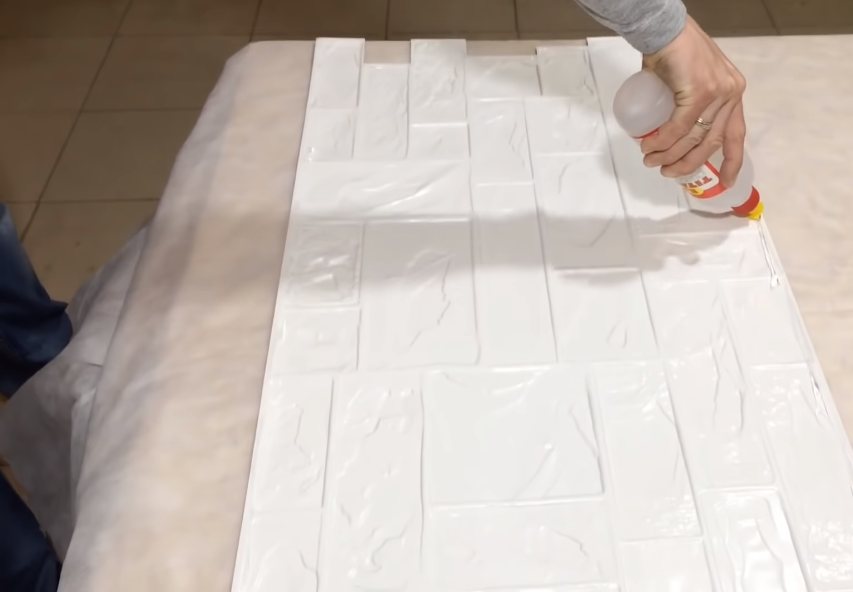 на изнаночную сторону подготовленных панелей наносится клеевой состав. если поверхность рельефная, клей следует наносить только на выступающие элементы;