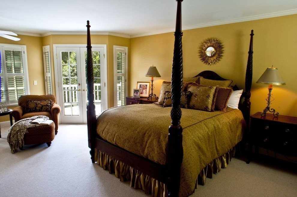 В спальне горчичный принято использовать для оформления стен или портьер. Чтобы обстановка получилась расслабляющей, выбирают светлые оттенки, которые удачно сочетаются с бежевым, белым, шоколадным цветом. Если отделка выполнена в коричневой палитре, ее удачно оживят детали горчичного цвета: портьеры, картины, ковер, плед.