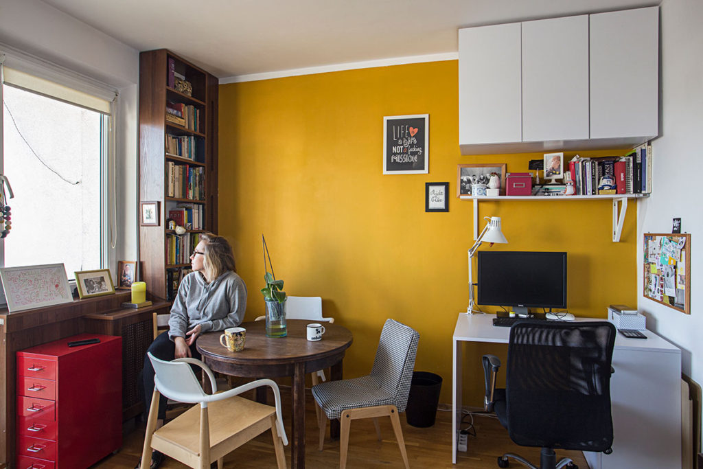 Кроме мебели можно задействовать и значительно большие интерьерные площади. Например, стены. Не забывая при этом, что соблюдение баланса с другими цветами обязательно. Такой прием часто используется дизайнерами для зонирования помещения без применения перегородок. Подобным образом можно выделить зону гостиной в квартире-студии, покрасив в горчичный цвет стену за диваном.