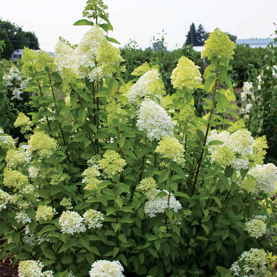 Но метельчатый сорт Limelight обильно цветет на ярком солнце, если его поверхностные корни замульчированы и не пересыхают