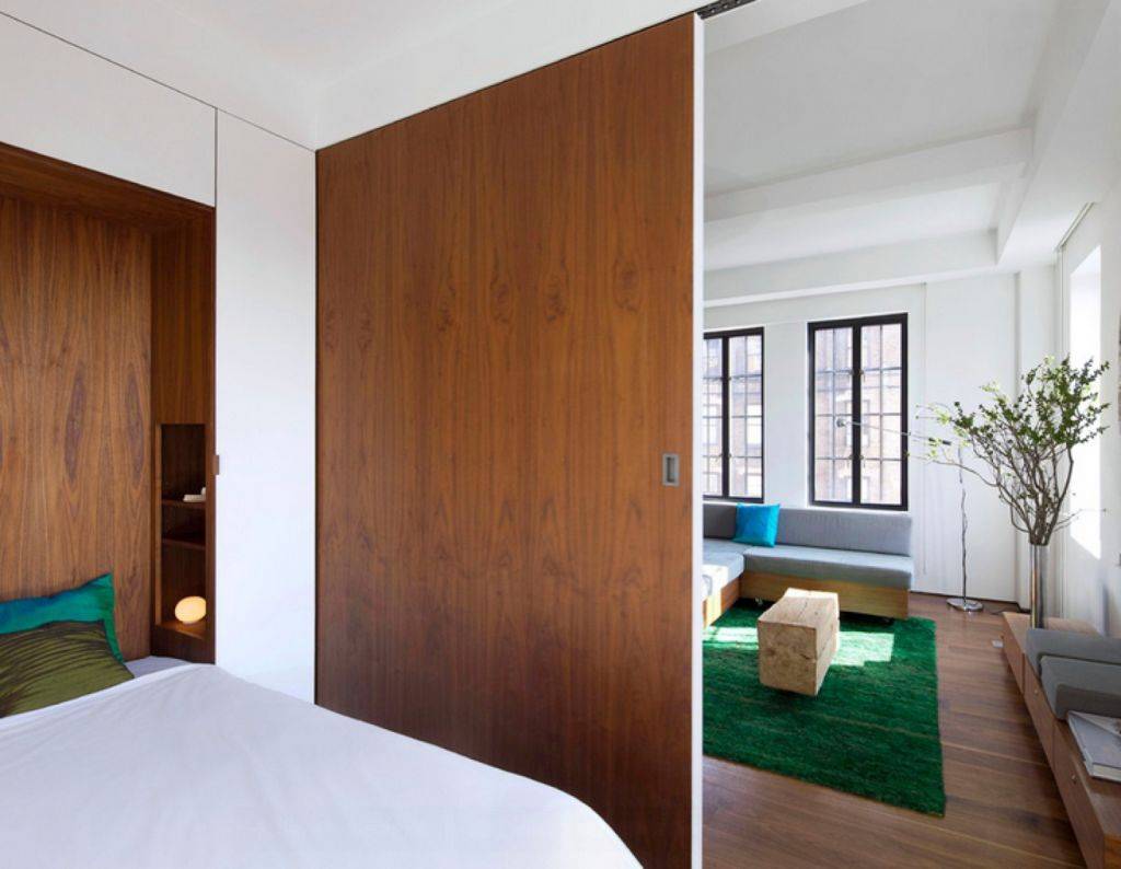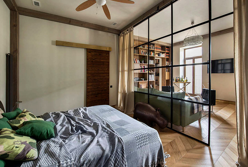 Лофт. Зоны выделяются путем установки ширм, гипсокартонных перегородок, стеклянных витражей.
