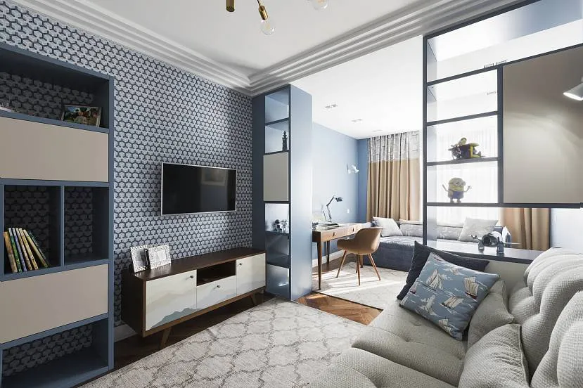 - перегородки – подходят для разграничения по возрасту: детская с кроваткой и учебным уголком, и взрослая зона, выполняющая роль гостиной с телевизором и спальни;
