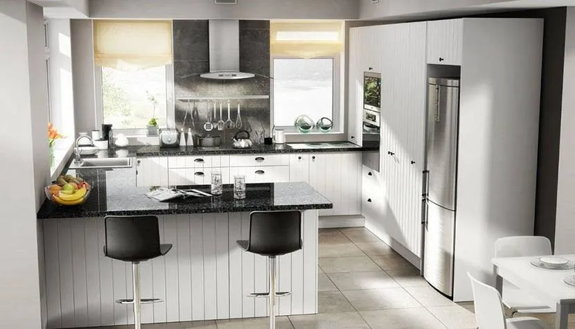 Такая планировка кухни может выполняться в двух вариантах. В первом случае всё необходимое размещается вдоль трёх стен, а во втором это классический угловой гарнитур и вынесенная поперёк помещения столешница или часть напольных тумб. П-образную или угловую планировку можно совмещать с островом, но в этом случае необходимо подбирать более компактную мебель, иначе может не хватить места.