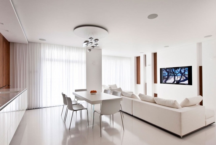 В объединённом пространстве дизайнеры рекомендуют использовать светлые или нейтральные краски. Здесь не должно присутствовать сложное смешение оттенков. Чем проще цветовая схема, тем лучше.