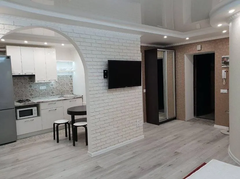 - Диван рекомендуется размещать спинкой к кухонной зоне, а телевизор – на стене напротив. Это будет удобно как отдыхающему, так и тому, кто находится на кухне.