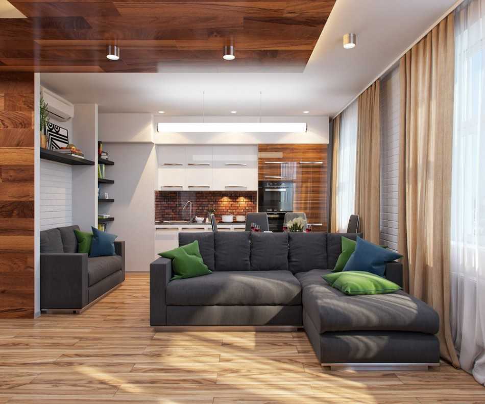 Комнату можно разделить на функциональные зоны. Выделить общий участок, где будет осуществляться передвижение между помещениями и рекреационный сегмент с местом для отдыха и приема гостей. В интерьере комнаты должна присутствовать максимально уютная обстановка с подходящей меблировкой, декором, отделкой и освещением. Для сохранения полезной площади в качестве зонального разграничения подойдет установка многоуровневого потолка, использование напольного порожка или облицовки разного цвета.