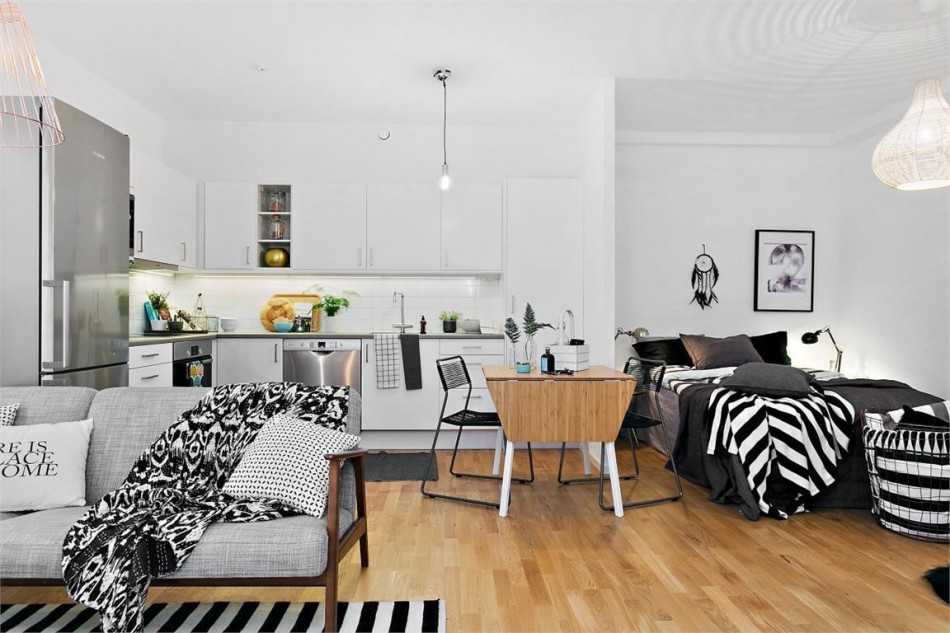 - Экономия места. Если в квартире несколько комнат, с помощью объединения двух зон освобождается одну из них для других нужд. Если же квартира однокомнатная, то вместо одной получаете две.