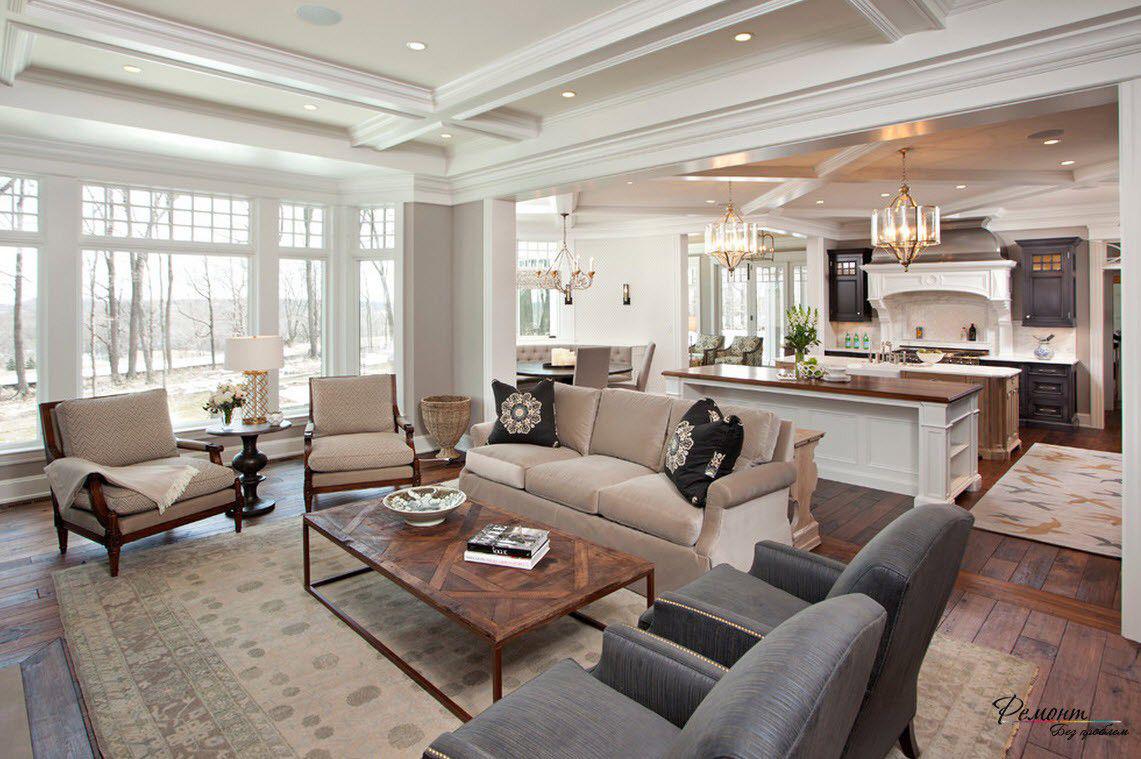 Стилевая направленность и размеры выбранного гарнитура, мягкой мебели и других мелких атрибутов могут обеспечить как тяжеловесный интерьер, так и организовать лёгкое, воздушное пространство.