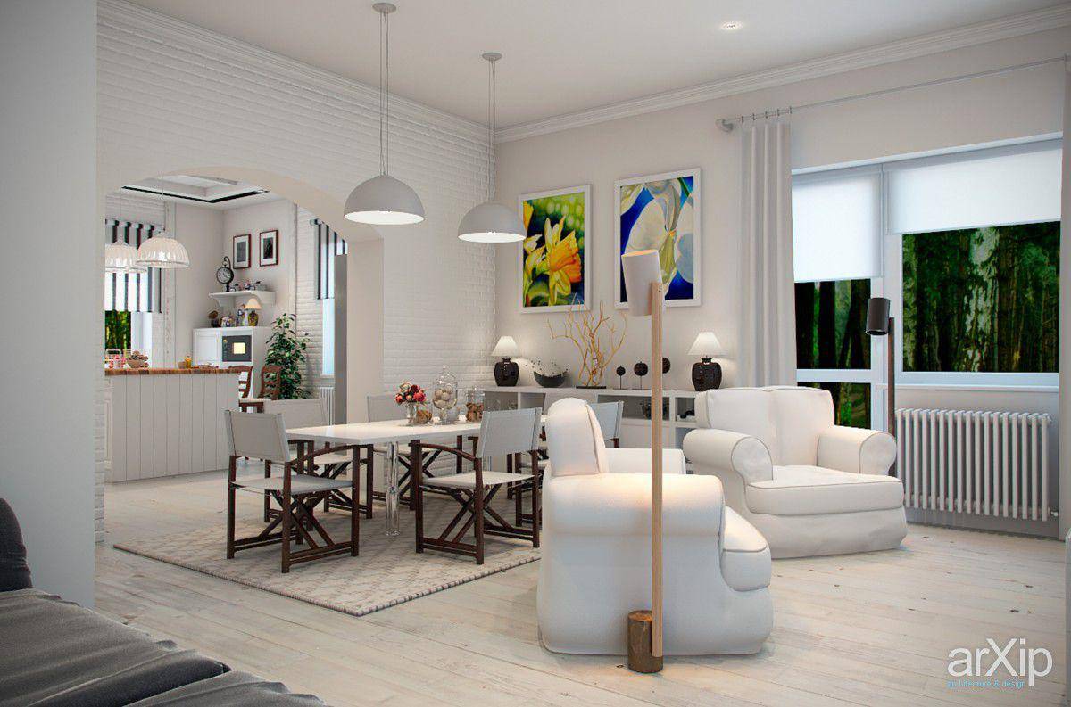 Сегодня в мы посмотрим фотографии гостиных, в интерьере которых присутствует столовый гарнитур, и поговорим о том, какие приемы помогают отделить обеденную зону от уголка с мягкой мебелью.