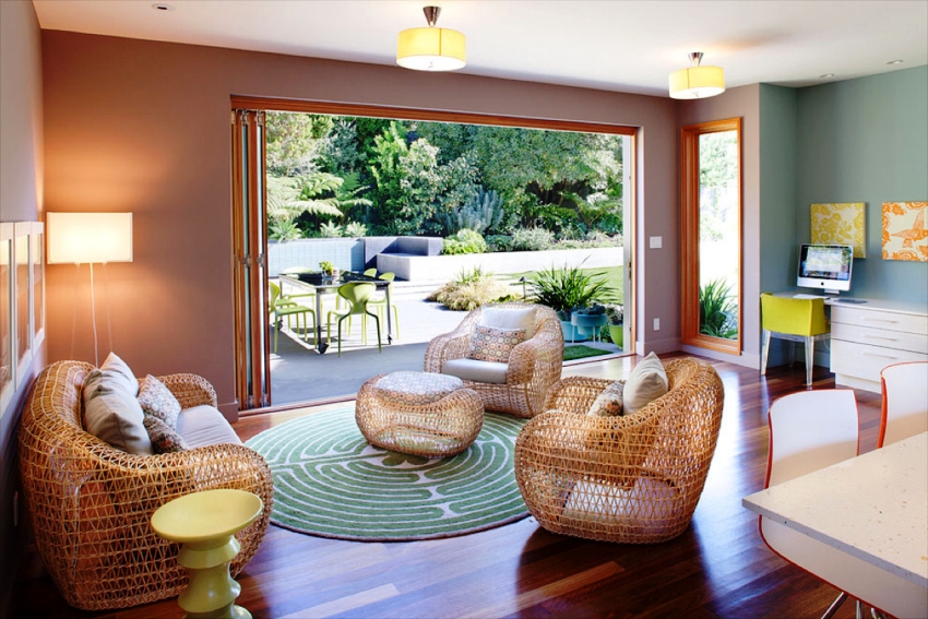 - Натуральные обои – необычное оформление стен. Для их изготовления используется бамбук, солома, тростник, пробка. Кроме того, они характеризуются практичностью и простотой в уходе. Такое оформление подойдет для современного стиля и хай-тек.