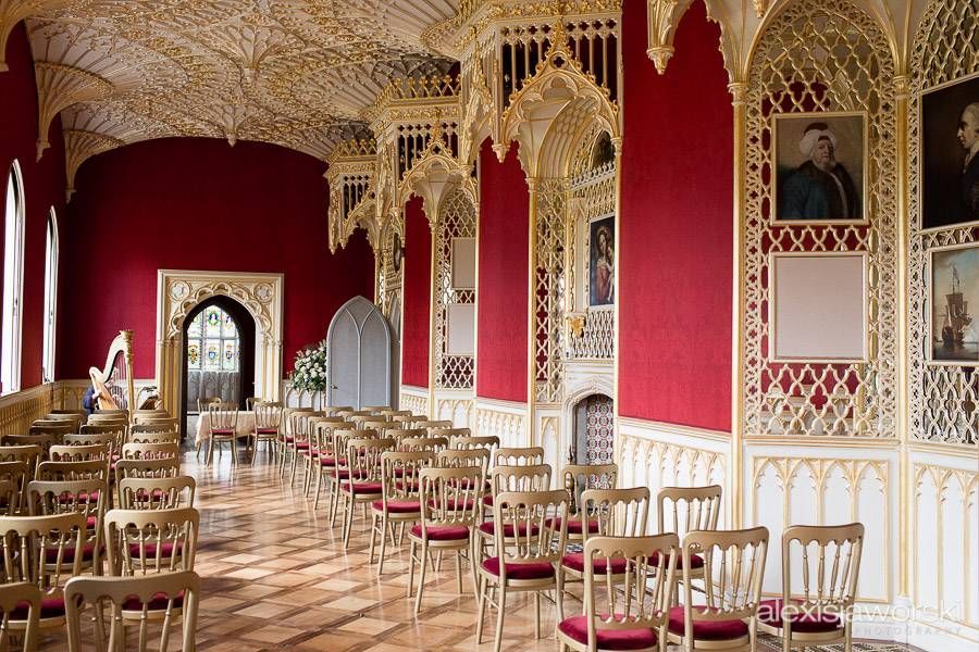 Ещё один всемирно известный готический интерьер из Англии. Гостиная в здании Арбери Холл, создана, также, в конце 18 века. В этом проекте, лепнина – главный материал отделки стен и потолка, она использована для прорисовки традиционного готического декора. Аналогов данный проект не имеет.