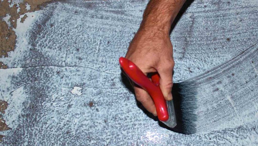 - С основания сметают пыль и грязь, металлической щеткой устраняют отслоившиеся куски штукатурки и других старых покрытий, реставрируют поверхность выравнивающей смесью и дают высохнуть.