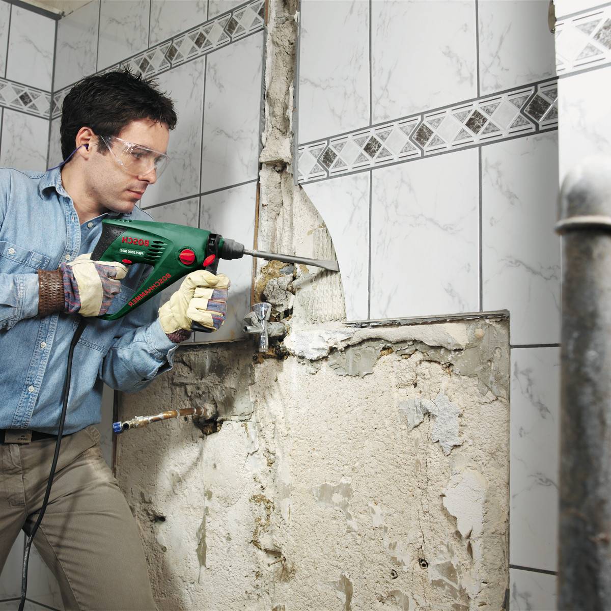 Начинать демонтаж нужно с крайней плитки, загоняя стамеску под основание размягченного раствора. Таким способом можно сберечь старую плитку и использовать ее вторично. Для более быстрой подготовки стен без необходимости сохранять кафель используется перфоратор с долотом. После проведения таких работ стены ванной необходимо зачистить наждачной бумагой, тщательно промыть влажной тряпкой.