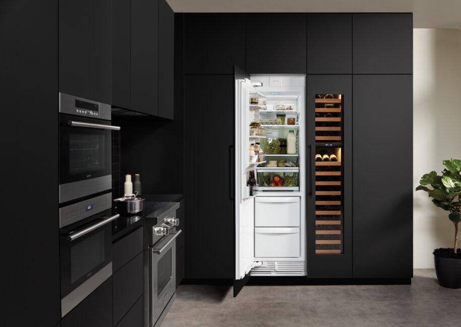 Холодильный шкаф стильно смотрится и по центру стены, если сочетается с другой техникой