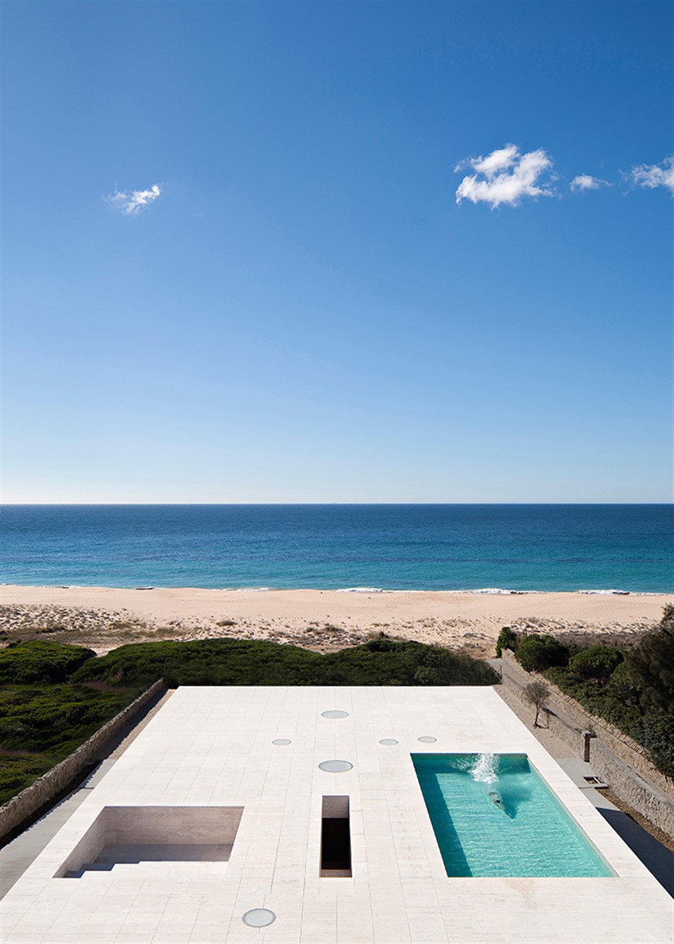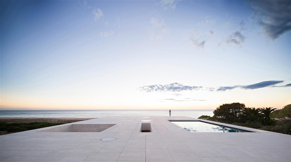 On a marvelous place like a piece of earthly paradise, at Cádiz, we have built an infinite plane facing the infinite sea, the most radical house we have ever made. At the very edge of the waters of the Atlantic Ocean, where the sea unites the new and the old continent, emerges a stone platform. At the place where all the ships from the Mediterranean used to pass and still pass by as they head off into the Atlantic.