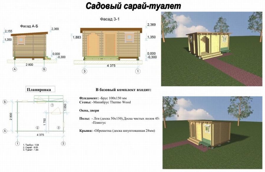 Здесь представлен подробный проект сарая с туалетом и перечислением строительных материалов