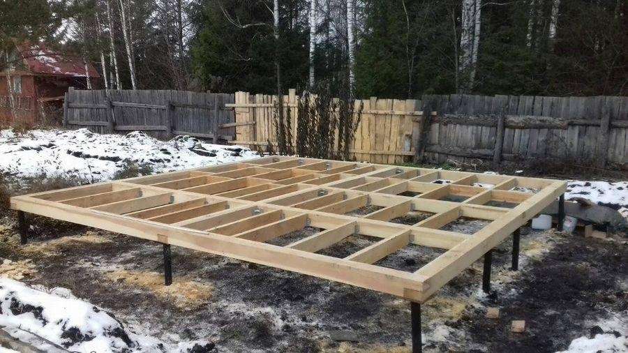 На основание возводят конструкцию. В первую очередь устанавливают угловые опоры, для них потребуется брус 100X100 мм или металлический профиль. Для строения и перекрытий подойдут те же материалы, что и для опор.