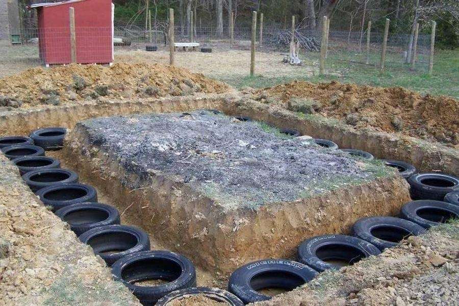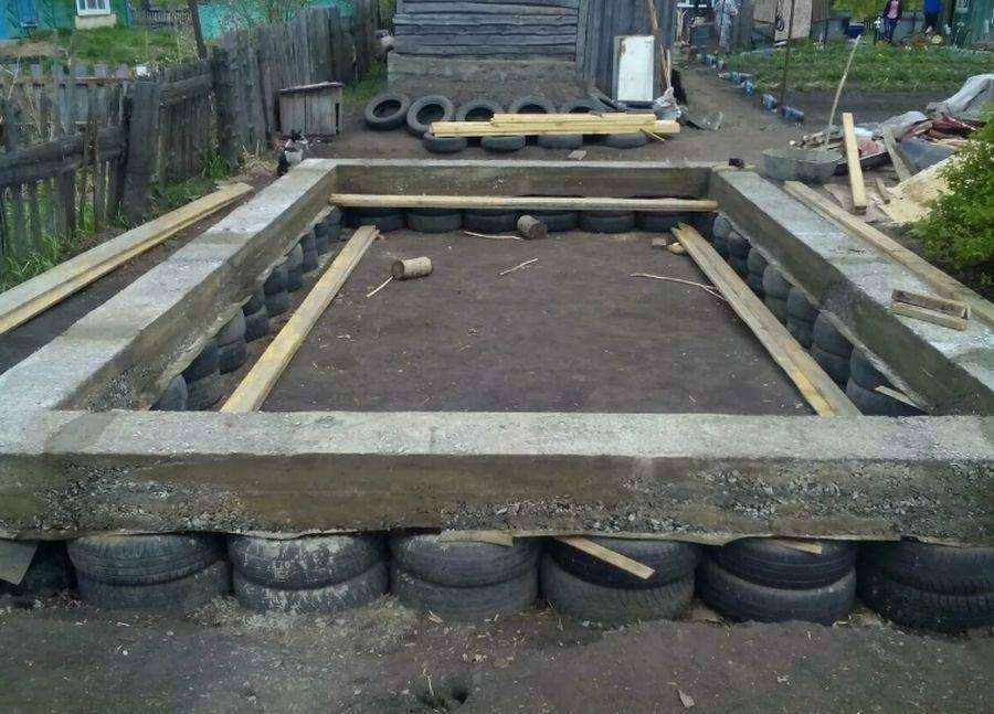 Ленточный фундамент на основе покрышек. В земле выкапывается траншея, в которую укладывается несколько рядов покрышек. Шины служат отличным материалом для усиления.