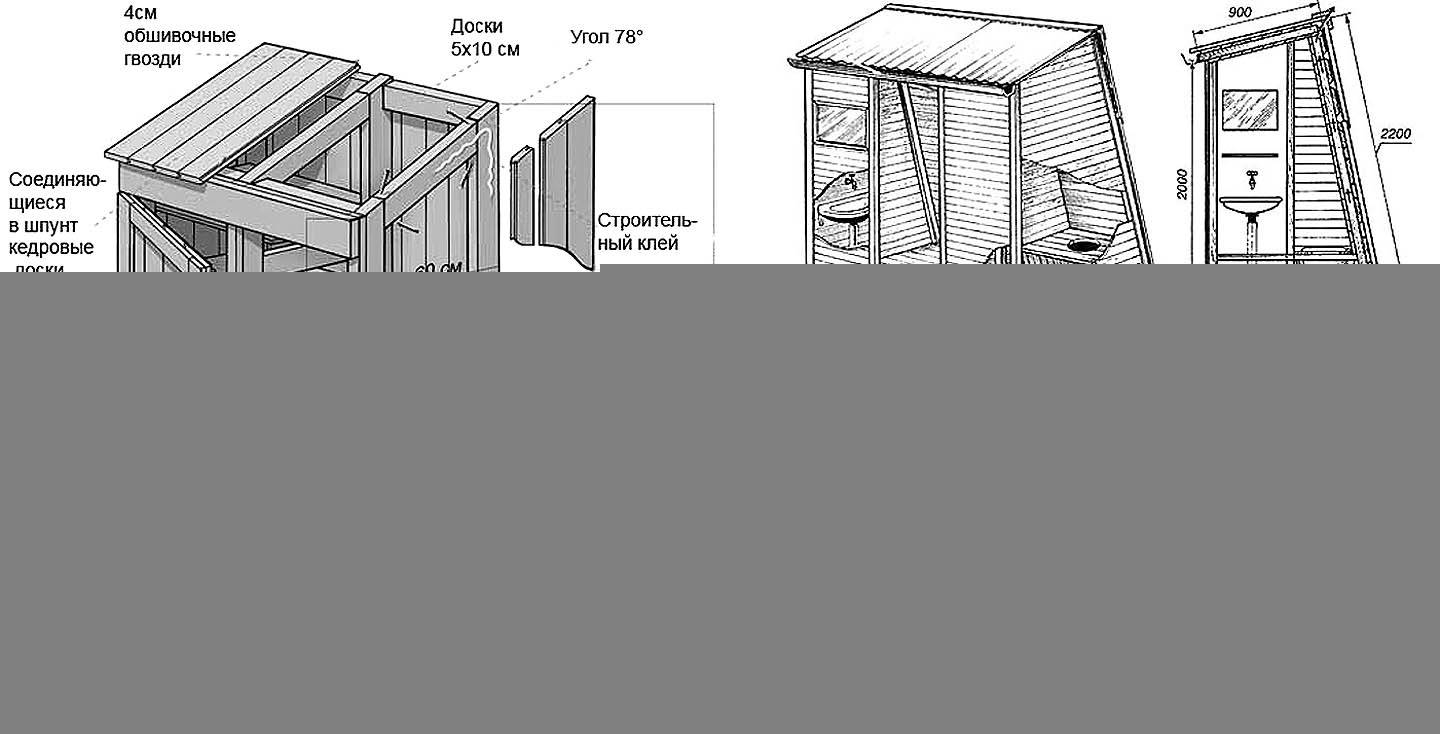 Под монтаж дачного мини-хозблока с туалетом и рукомойником нужно под его углым выкопать 4 ямки на штык лопаты, заполнить их щебнем и утрамбовать. Затем укладываются бетонные плитки от 200х200х40, а на них, по длинным сторонам – балки из бруса от 100х75, которые закрепляются вбитыми в грунт стальным анкерами. Это и есть все основание сооружения; остальные детали каркаса из брусьев от 60х60. Обшивка – шифер, профлист, любые другие пригодные для этого листовые материалы. Поскольку условия расположения выгребной ямы достаточно жесткие, туалет типа пудр-клозет: приемник отходов жизнедеятельности – ведро с торфокрошкой. Слив из рукомойника в дренажную трубу (выпуск – на глубину не менее 1,7 м).