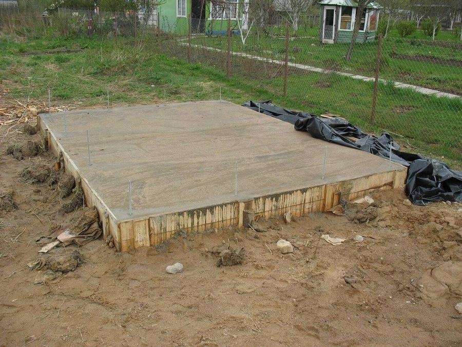 Вид готового монолитного фундамента после полного залития. Плитный или монолитный фундамент под хозблок чаще всего используют для возведения построек на глинистых почвах и суглинках.
