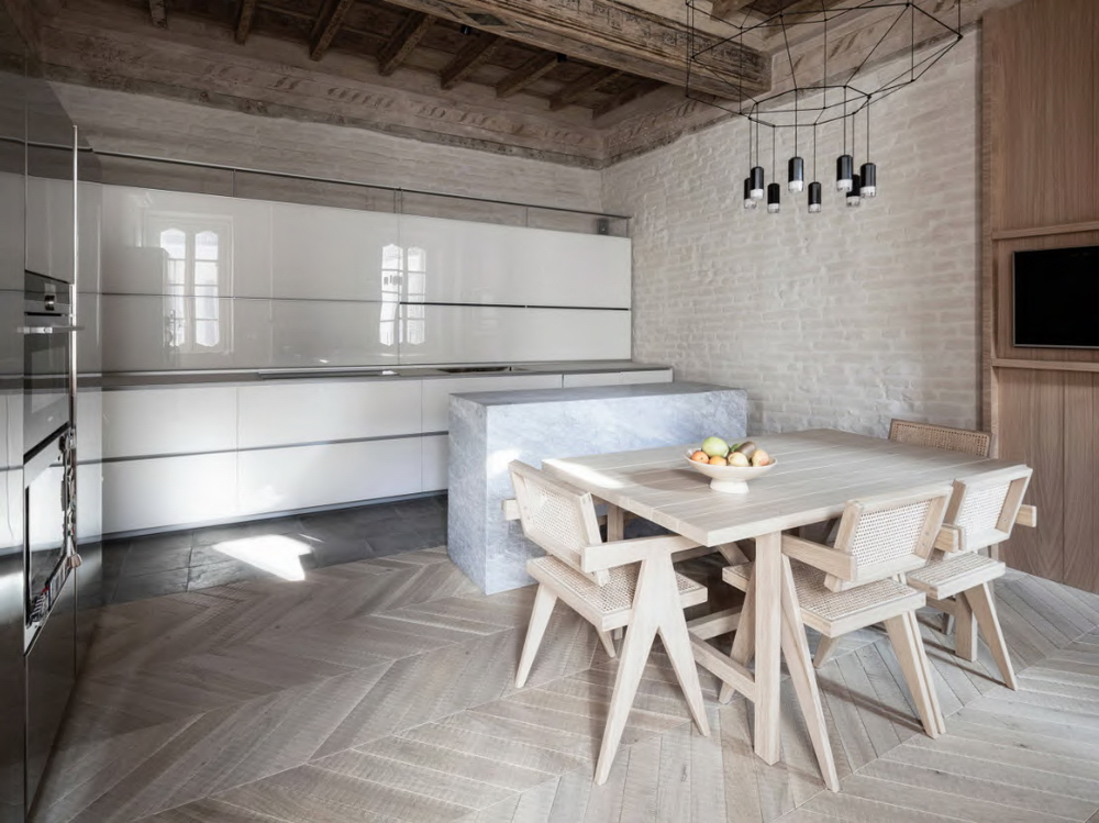 Разная отделка позволяет зрительно разграничить функциональные зоны. Используют кафель и древесину, различные оттенки одного вида покрытий, контрастные решения. В современном стиле уместны и другие идеи дизайна кухни и столовой – трендом текущего года является отделка поверхностей одним материалом, в то время как для гостиной выбирают традиционные решения. Среди актуальных тенденций керамогранит, фактурный бетон, глянцевая керамическая плитка в формате паркета. Эти материалы выпускаются в ультратонких форматах, что и позволяет укладывать их не только на пол, но и на стены.