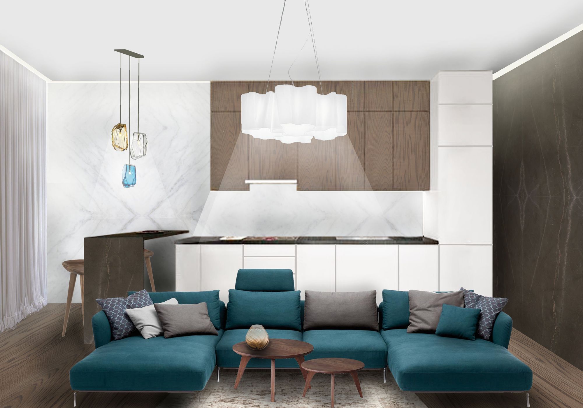Подвесные светильники над барной стойкой также участвуют в зонировании пространства кухни-гостиной