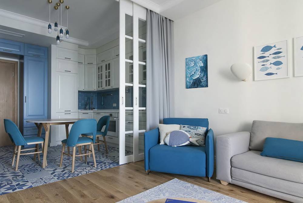 Если нужно время от времени разграничивать зону кухни и гостиной полностью, то легкие стеклянные или пластиковые раздвижные перегородки будут идеальным вариантом. Помимо этого, с помощью подобного приема есть возможность создать неповторимый дизайн комнаты.