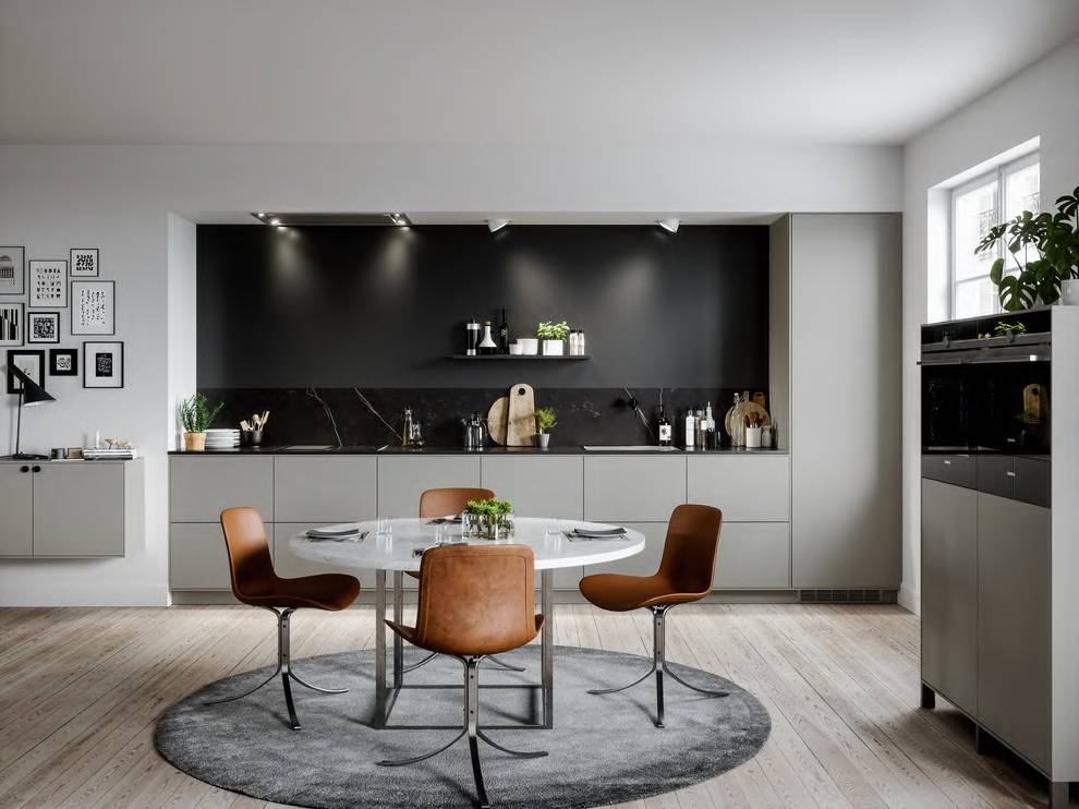 Главное, что делает кухню кухней – это посуда, холодильник, кухонные принадлежности и мелкая бытовая техника на столешнице, подвесные рейлинги и т.д. достаточно всё надёжно «спрятать» это в системах хранения, использовать решения со встроенной техникой, выполнить фасады и поверхности в стиле минимализма, и кухня превратится практически в «невидимку».