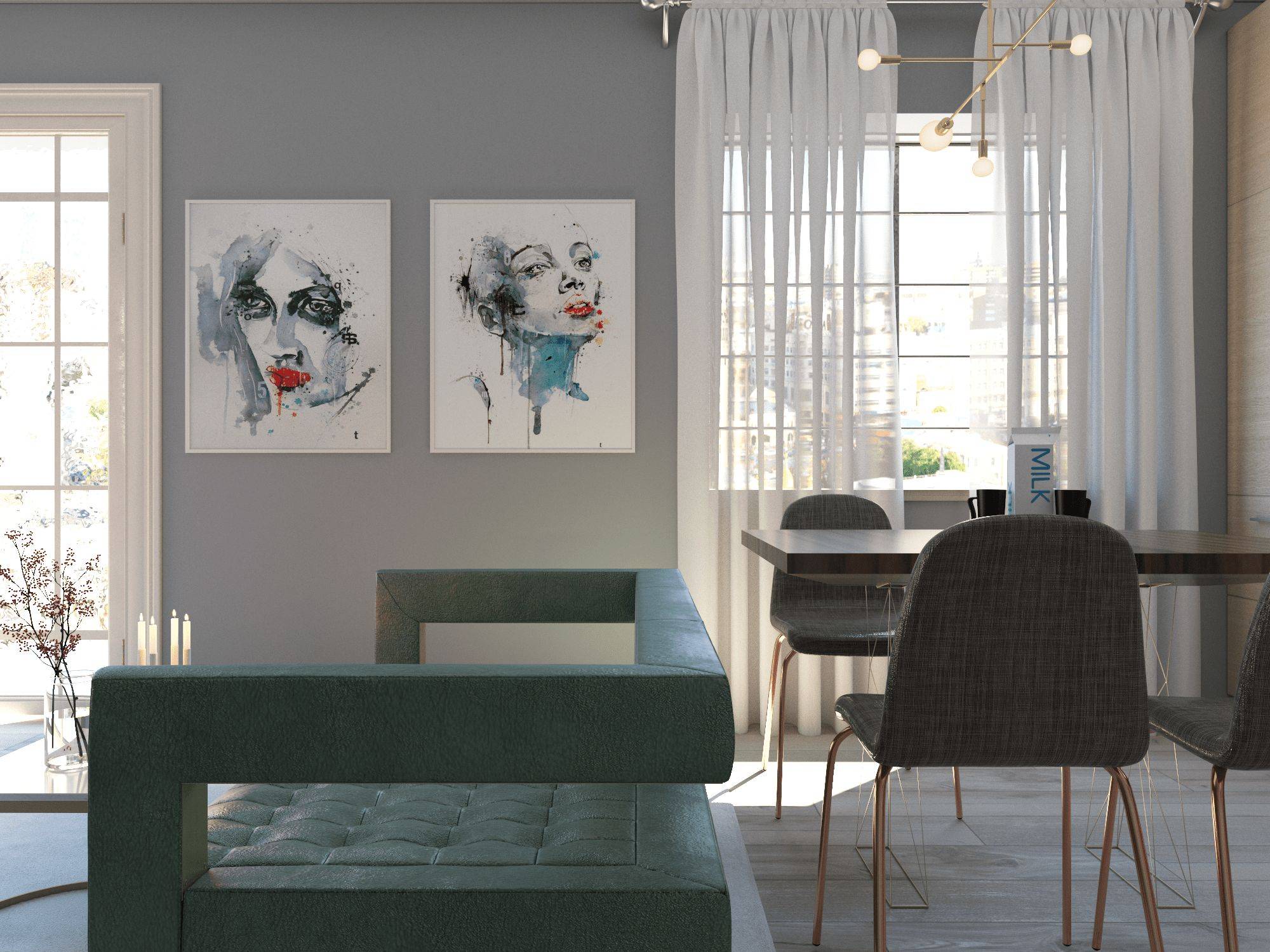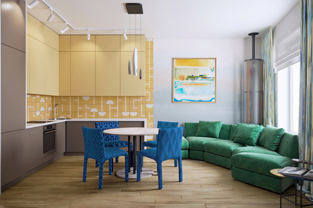 Это может быть кислотных цветов огромный мягкий уголок в гостиной, яркая картина или современная инсталляция. Присутствие яркого акцента «спрячет» и кухню, и что угодно.