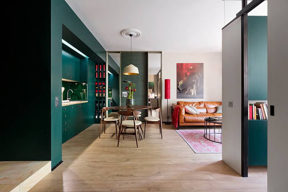 Раздвижные перегородки вместо стен между комнатами – одно из наиболее простых решений, если необходимо сохранить четкое разделение, но предоставить возможность трансформации помещения. Дверные полотна могут занимать увеличенный проем, арку или же действительно весь промежуток между гостиной и кухней.
