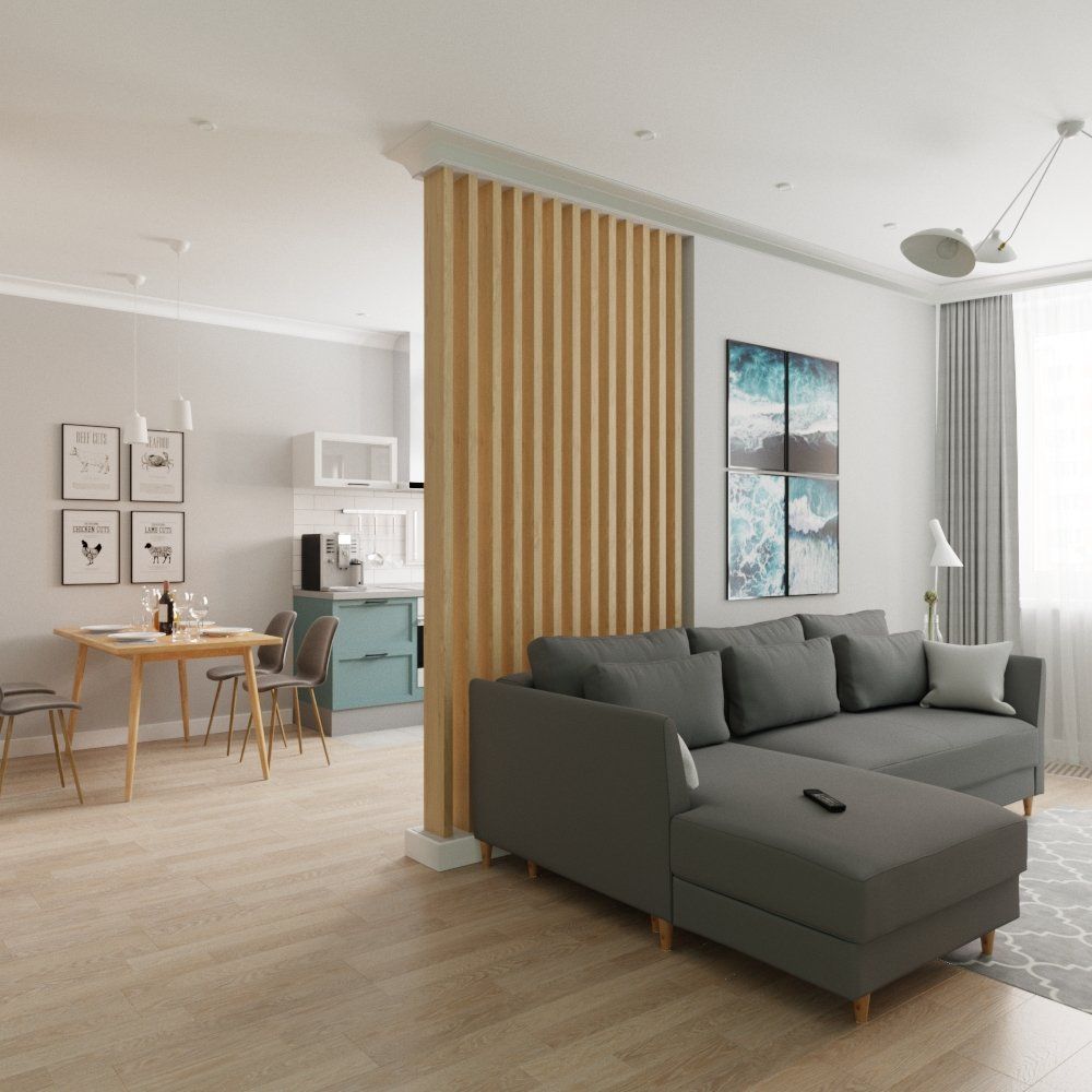 Классика зонирования — установка перегородки. Это может быть сплошная стена из гипсокартона или кирпича. Более легкие прозрачные конструкции делаются из дерева, стекла или металла. В этом проекте мы создали комбинированную перегородку, в которой деревянные брусья перекликаются с деревянным обеденным столом, объединяя дизайн комнаты по стилю и цвету.