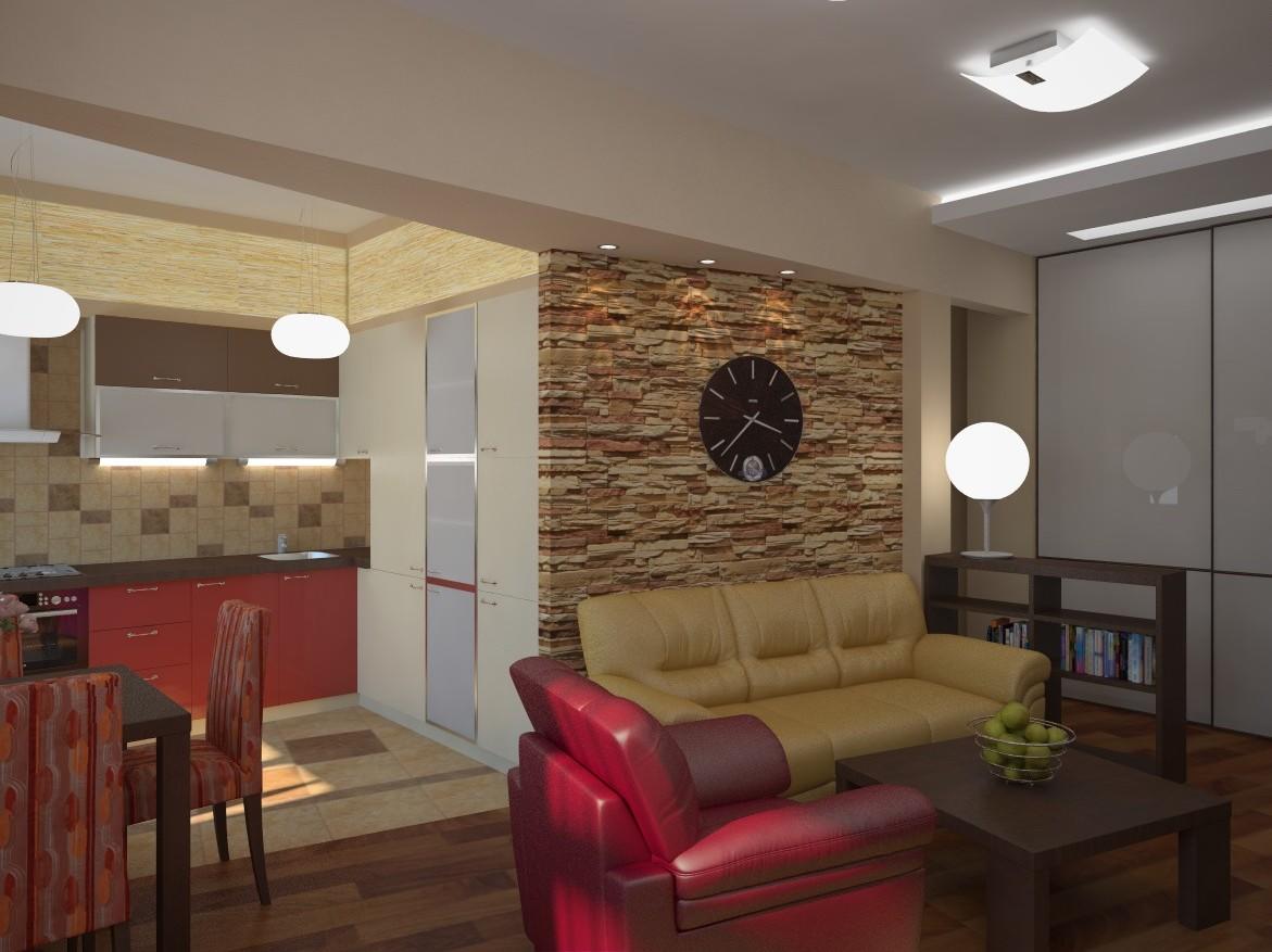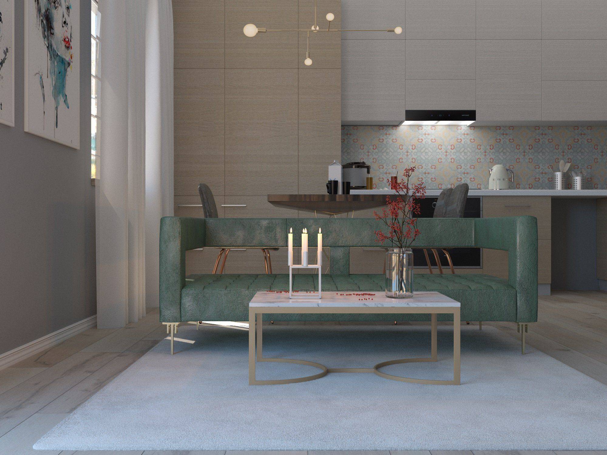 В качестве напольного покрытия в зоне гостиной лучше всего выбрать ковровое покрытие, паркет или ламинат, а для области кухни отлично подойдет напольная плитка или линолеум. Чтобы создать единое пространство, можно сделать подиум. Стены в гостиной можно оформить с помощью декоративной штукатурки или обоев, а область кухни можно оформить керамической плиткой или специальными панелями.
