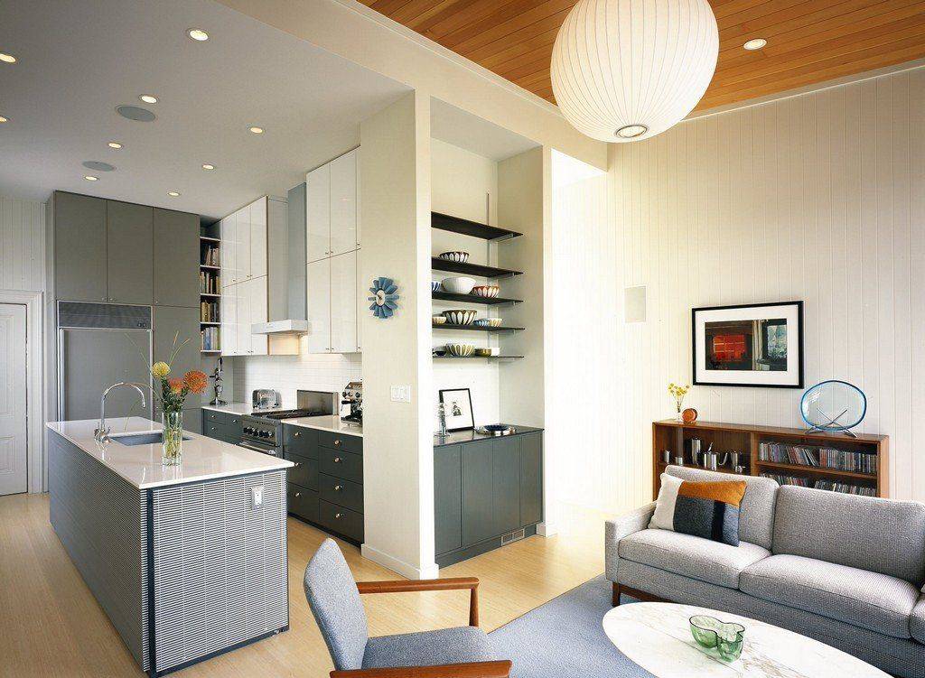 Кухня – излюбленное место, где очень приятно собираться всей семьей, однако, не всегда хватает свободного пространства, потому как кухни в многоквартирных домах достаточно небольшого размера. Решить подобную проблему поможет объединение кухни и гостиной. Чтобы создать необычный и оригинальный дизайн свободного пространства, совершенно не обязательно оформлять обе эти зоны одинаково, потому как за счет применения разных требуемых отделочных материалов и создания условной перегородки, вполне возможно реализовать все свои идеи. Граница, отделяющая кухню от гостиной, может быть различной.