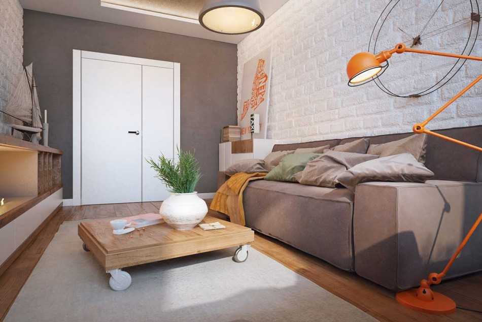 Возле дивана уместно разместить оригинальный и гармонично вписывающийся в дизайн комнаты журнальный стол или компактных размеров комод. В зависимости от предназначения жилого помещения, размещать мебель в комнате 16 кв. м. можно в различных вариациях.