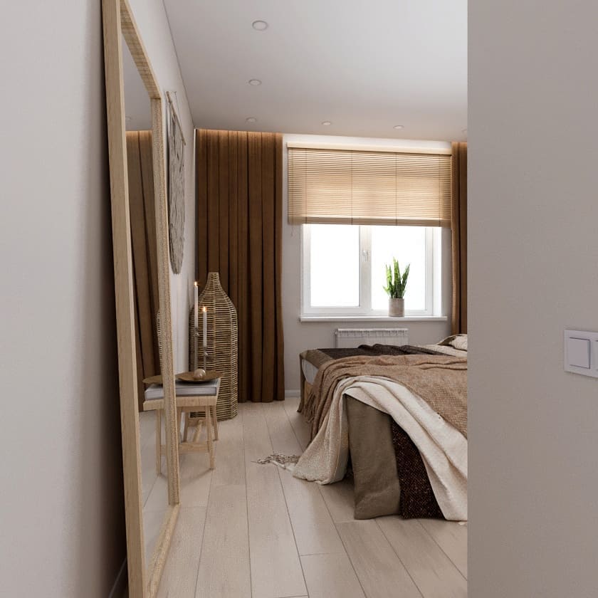 В маленькой спальне особенно актуальны кровати-подиумы, потому что во вместительные коробы поместится не только белье, но и другие вещи. Используй зеркала и стекло, которые визуально расширяют пространство. Стирай видимые границы и рисуй новые за счет отделки, акцентов и расстановки мебели.