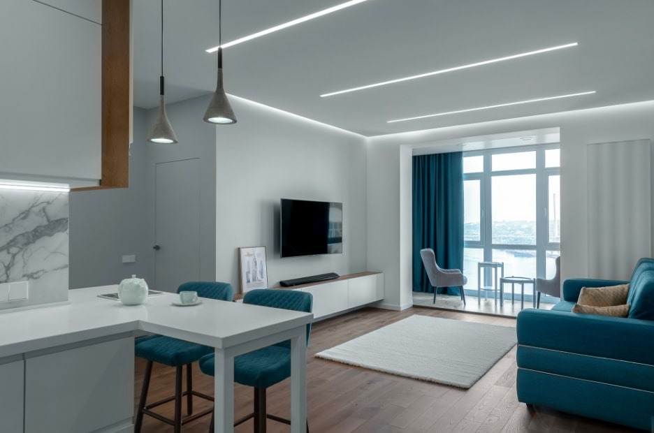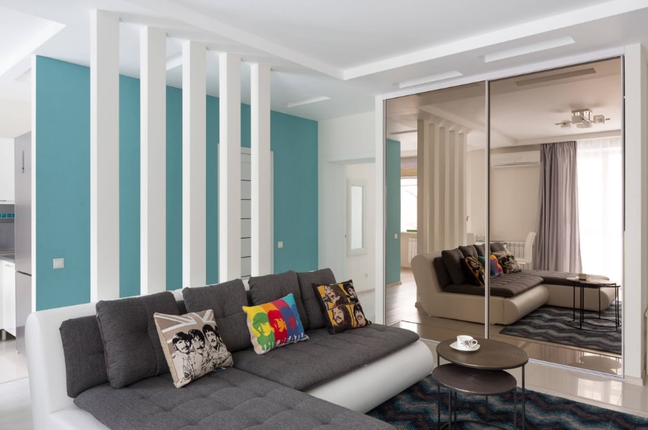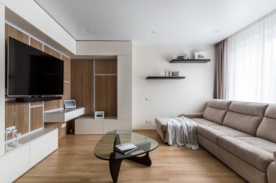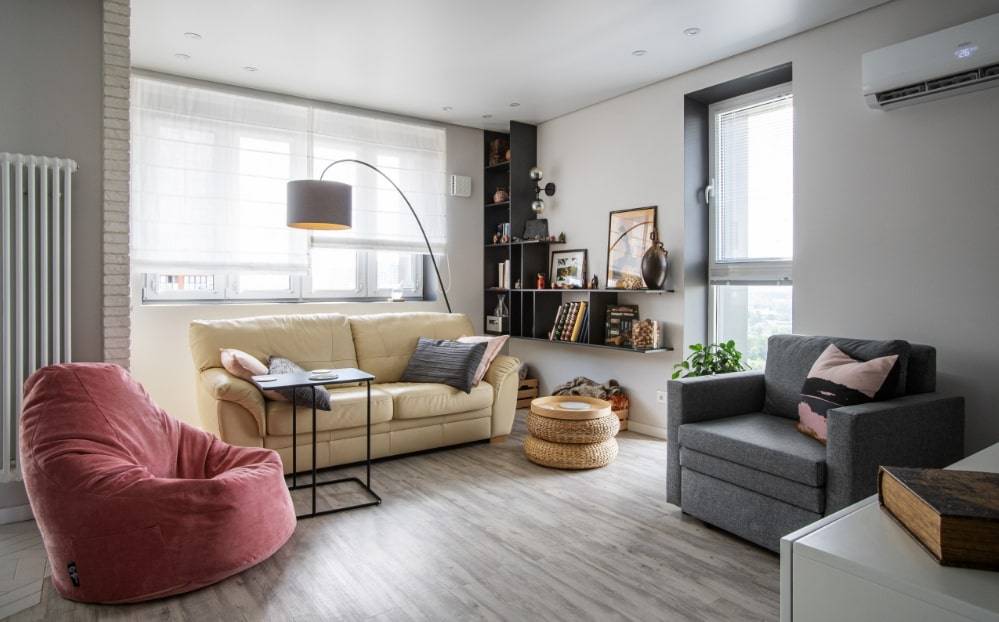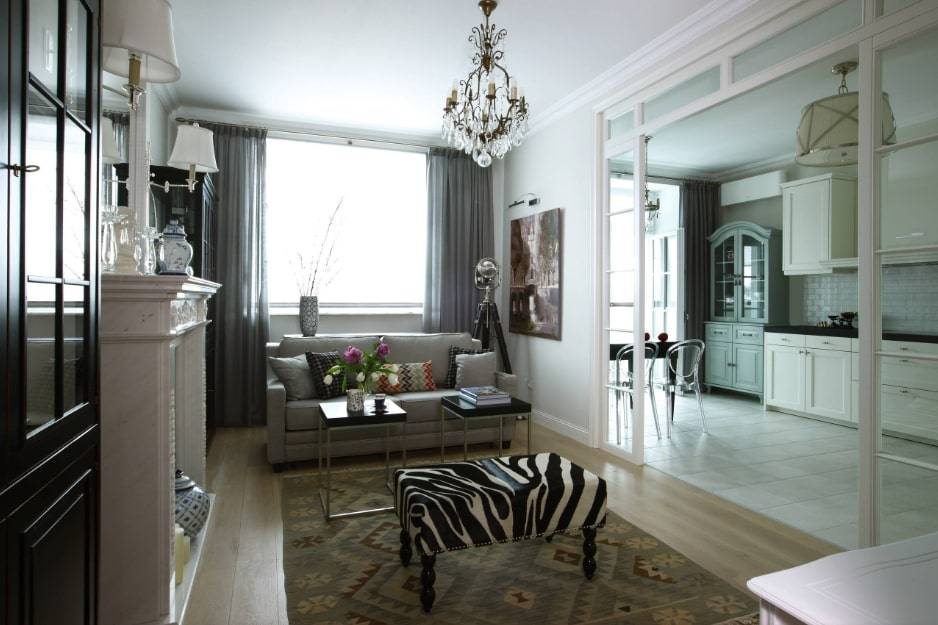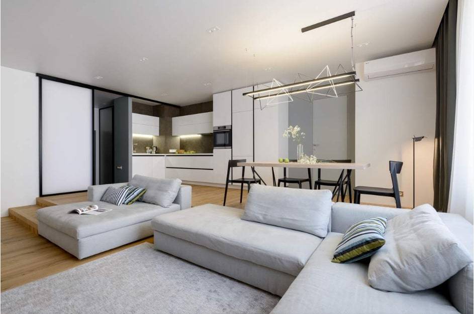 ✓ Используйте смежные помещения. Чтобы увеличить площадь и получить возможность значительно расширить функционал гостиной, можно объединить её с кухней или балконом.