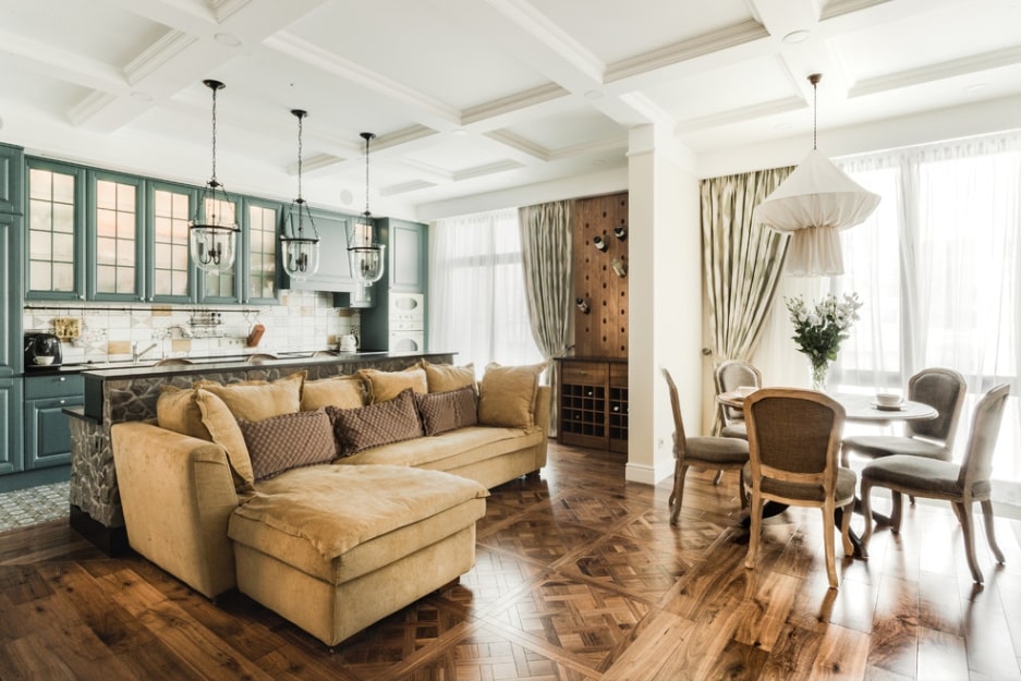 Напольное покрытие оформляется уютной древесиной. Это может паркет или паркетная доска (классика), массивная доска (прованс и лофт), ламинат (все стили), наливной пол (минимализм).