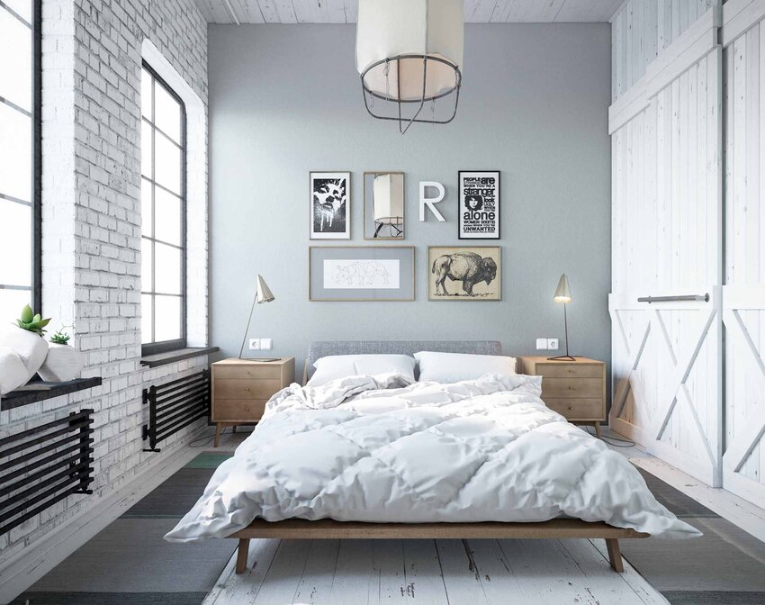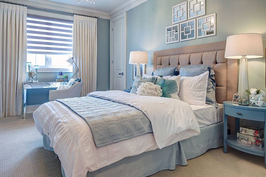 Скандинавский стиль. Обычно основным цветом является белый, его эффектно оттеняют серые, голубые или кофейные тона. Пространство словно наполнено прохладой и объемом, даже если спальня меленькая. При этом оформление достаточно сдержанное, его можно оживить за счет текстиля или нескольких картин на стенах. Отлично подходит для помещений, окна которых выходят на южную, восточную либо юго-восточную сторону.