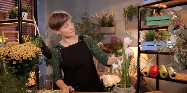 Это может быть цветок, веточка или даже листик. Кроме того, важно сохранять динамику композиции. Для этого нужно размещать все детали под небольшим углом по отношению к поверхности или вазе. Если в процессе понадобятся веточки, то рекомендуем выбирать изогнутые стебли, плетеные сухоцветы и другие подобные элементы