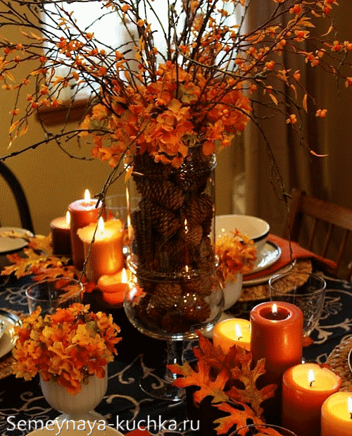 - Вы можете разложить на подносе, на котором будет лежать тыква, или просто на столе осенние листья и каштаны, а уже сверху поместите свою работу или оставьте их в таком виде.