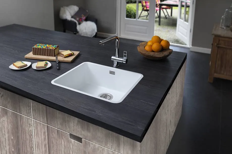 - Эстетика. У чаши нет швов, она имеет привлекательный вид, вы всегда сможете подобрать вариант нужного цвета, размера и формы для конкретного кухонного дизайна. Некоторые компании изготавливают мойки на заказ, по индивидуальному эскизу, что, по понятным причинам, обойдется дороже.
