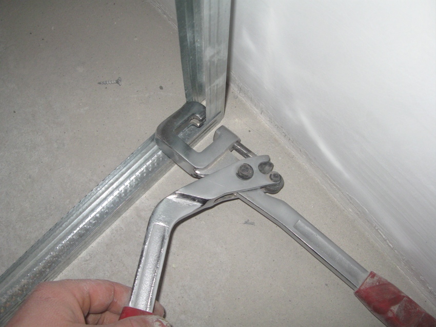 Данное приспособление используется для скрепления профиля при монтаже каркаса. Оно позволяет соединять профили по методом просечки с изгибом, не применяя дополнительные крепежи. Для надежности фиксации обычно делают несколько просечек, расстояние между которыми составляет около 5 мм. При этом по сравнению с использованием заклепок, поверхность каркаса остается идеально гладкой.