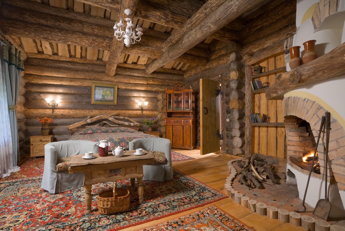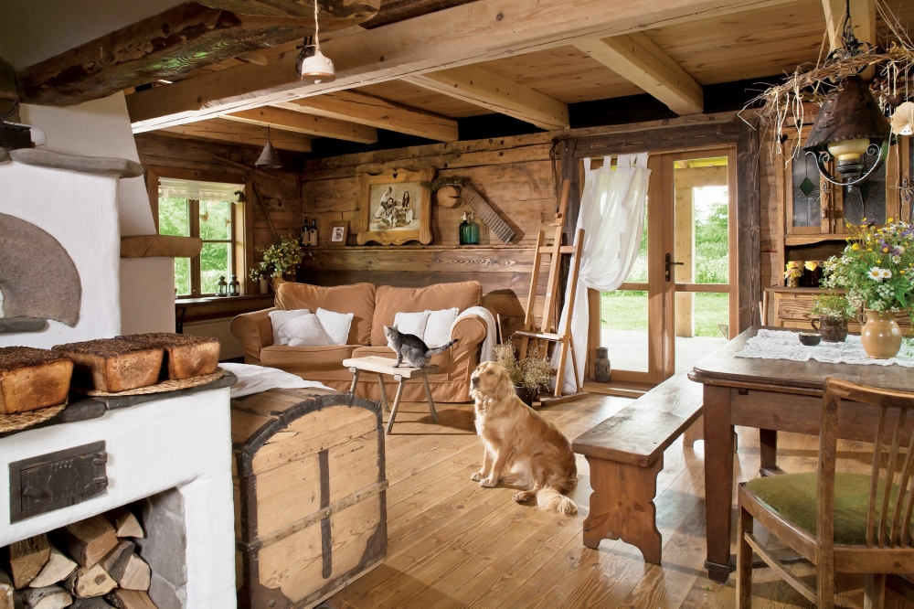 Фоном для мебели и декора дачного дома служат деревянные стены. Отделывать теплый природный материал не желательно. Если не удается покрыть лаком и сохранить рисунок древесины, то можно ее покрасить.