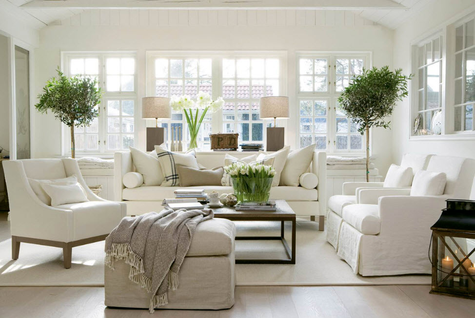 Скандинавский. Воплощает легкость и свежесть, поэтому отлично подходит для малогабаритной гостиной. Белые стены, потолок создают фон, расширяющий границы.