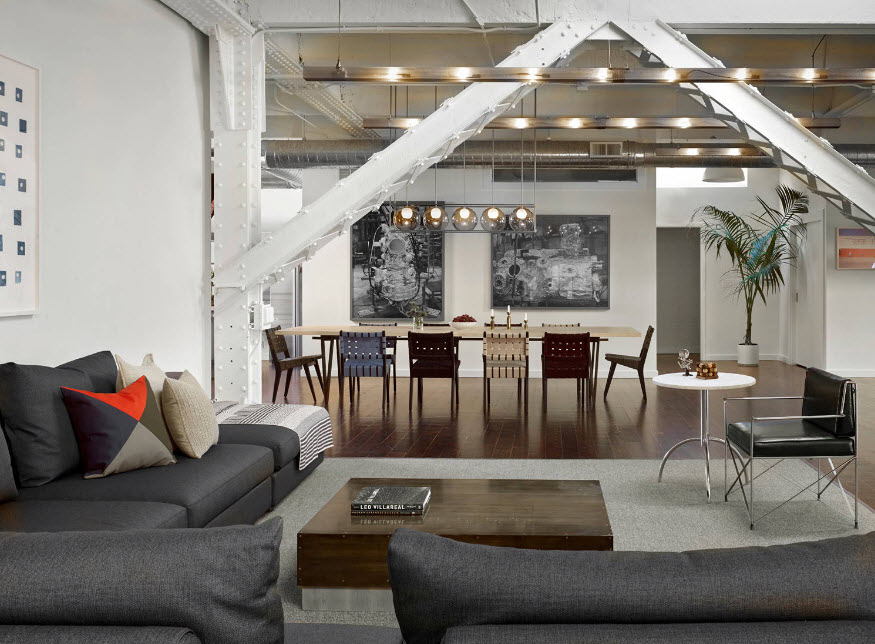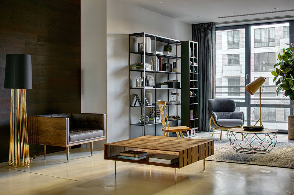 Современный. Отличается функциональностью и удобством. Здесь гармонично существуют дерево, бетон, стекло. Графические детали на стенах делают интерьер интересным, а диванные подушки, коврик и плед смягчают его.