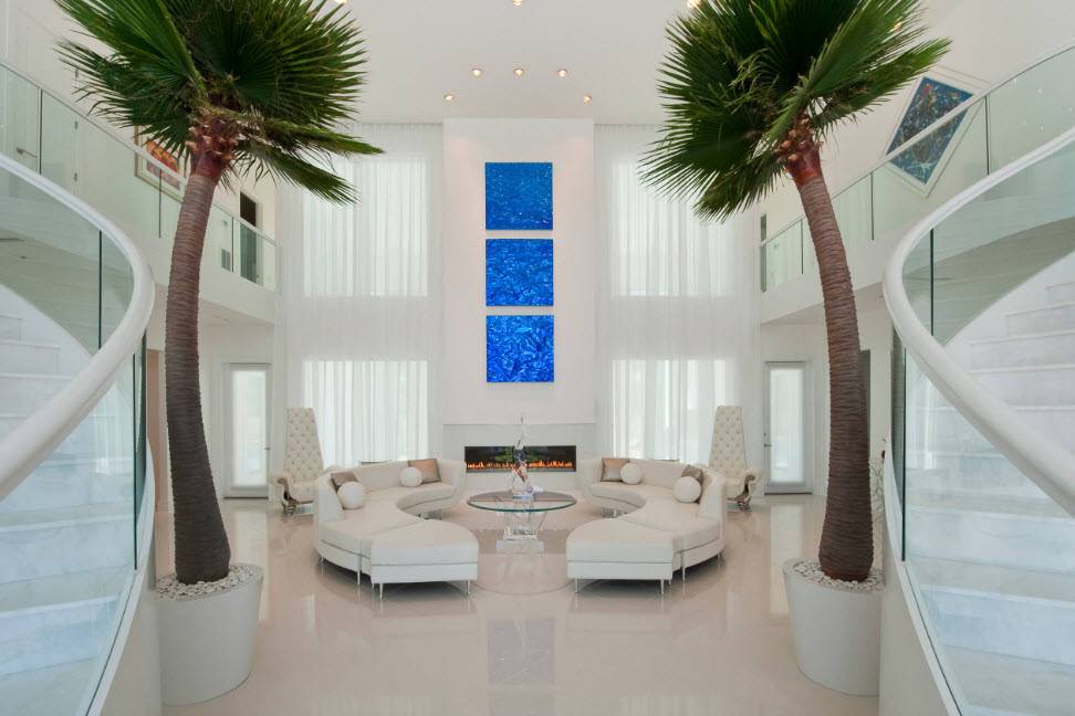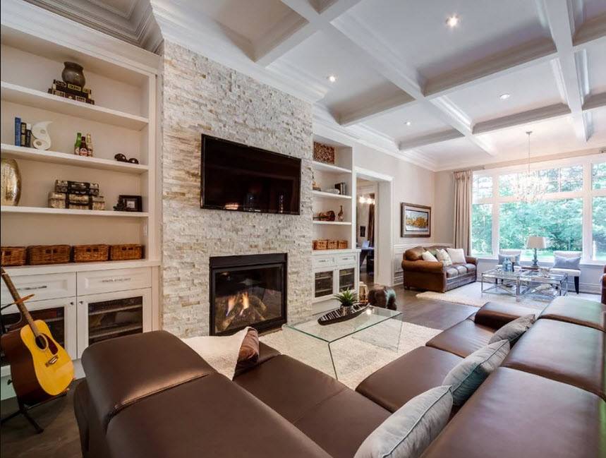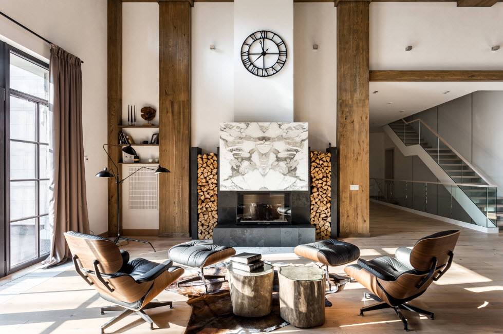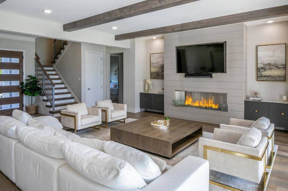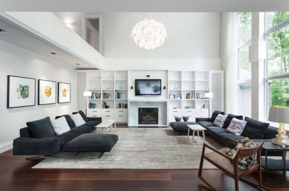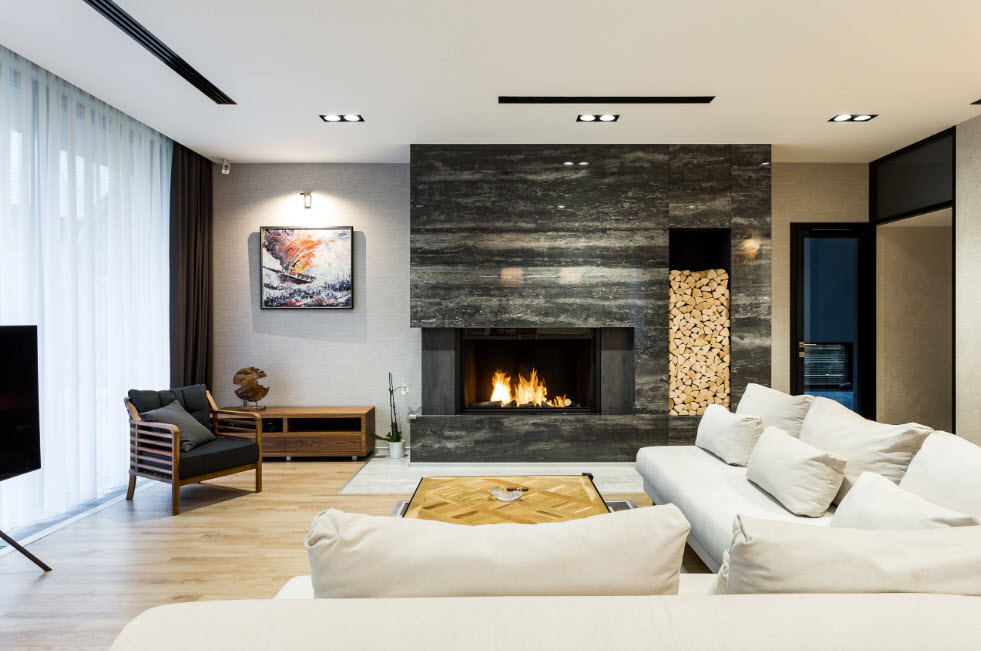 В этой гостиной уже сама отделка и каждый предмет являются элементом декораФото мебели для зала в современном стиле, которая сама по себе может служить хорошим украшением гостинойКамин как элемент декора в гостиной квартиры-студии