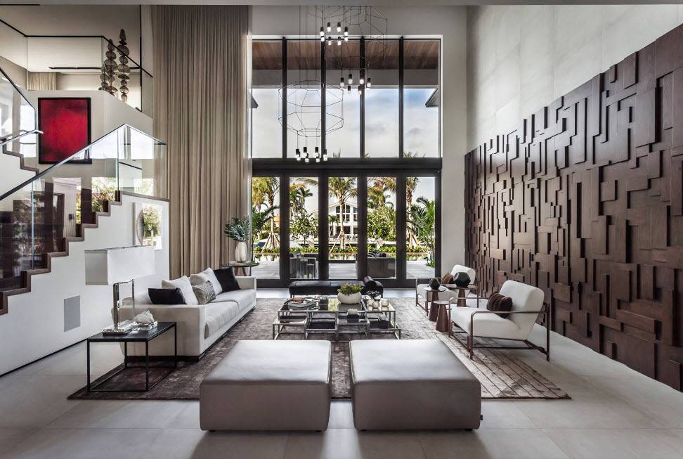Интерьер зала создает сочетание мебели и обработки поверхностей. Последняя может быть яркой и экспрессивной или, наоборот, незаметной. Но она задает тон и настроение дизайну интерьера. От нее зависит наполнение, желание находиться в помещении.