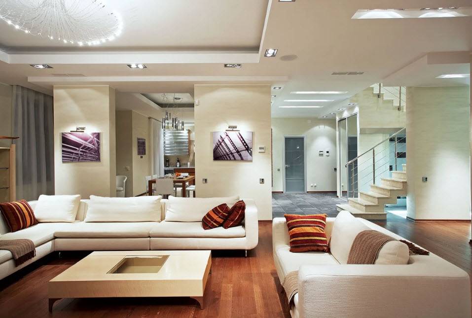 Прежде всего, хотелось бы сказать о цветовой гамме отделочных материалов, используемых для оформления большой гостиной. Конечно же, особых ограничений здесь нет, но все же дизайнеры не рекомендуют использовать темные материалы, отдавая предпочтение более светлым тонам. Единственное исключением – это темно-коричневый или шахматный черно-белый пол. Для стен и потолка лучше выбирать светлые оттенки, наполняющие комнату воздухом и чувством свободы.