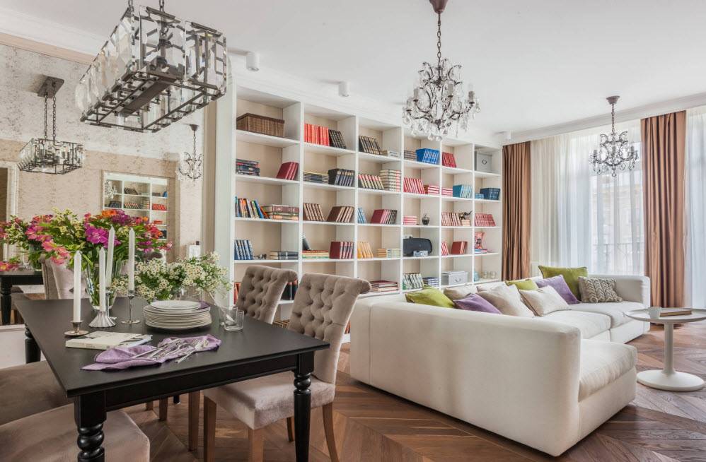 Также в гостиной могут устанавливаться полки, книжные шкафы или стеллажи и витрины со стеклянными фасадами. В случае открытой планировки, как в квартире студии, в зале может быть установлен обеденный стол, отделённый от остальной обстановки диваном или невысокой перегородкой.